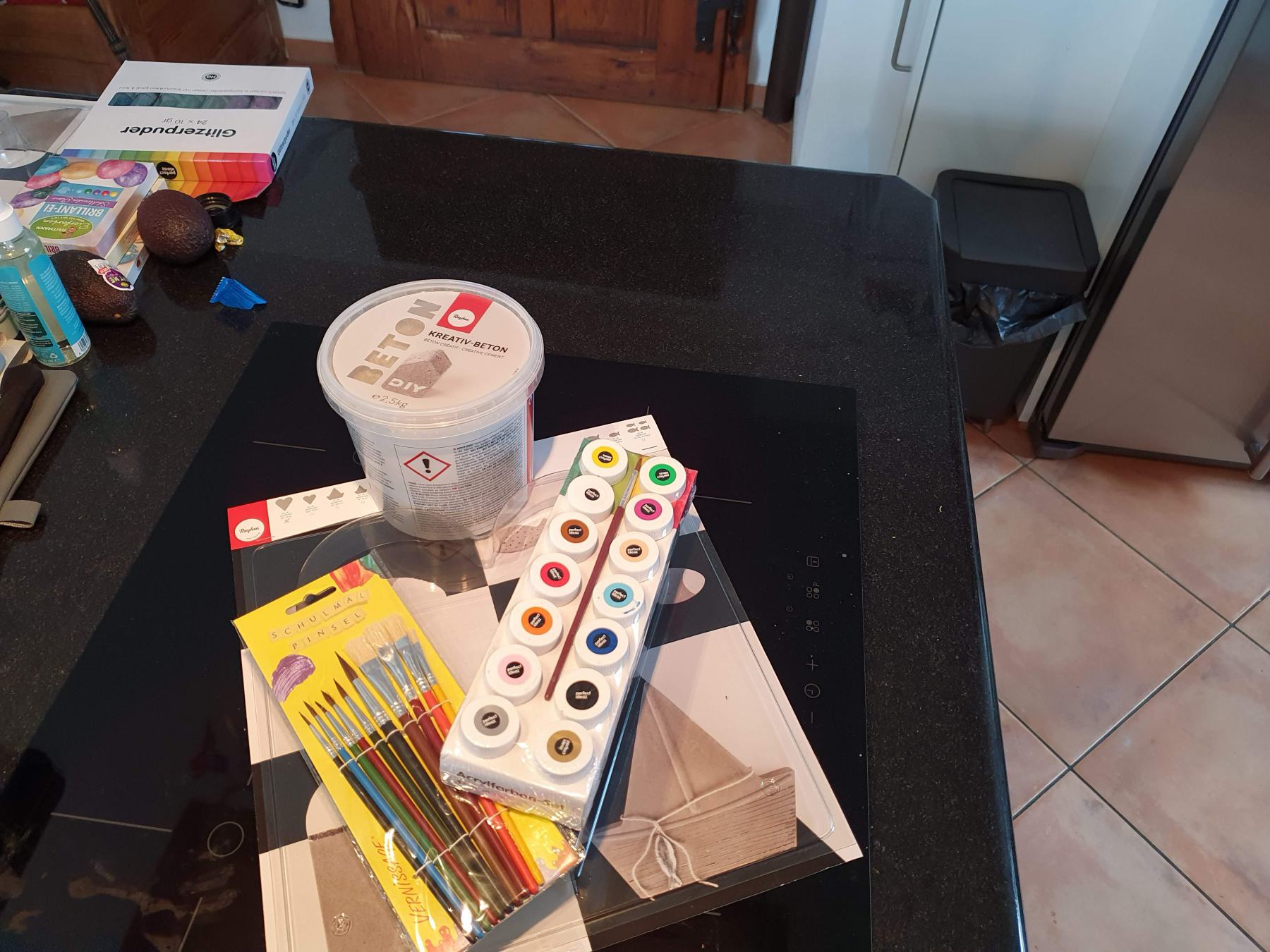 Es gibt Schnell-Beton. Natürlich im Baumarkt (was uns heute auch nicht weiterhilft), aber auch bei Amazon zu bestellen. Der ist wirklich schnell!! Dafür aber sehr fein und es geht super schnell. Zwischen Anrühren und fertig in der Form habt ihr aber nur 2 Minuten. Das muss wirklich sehr schnell gehen. Wer es sich zu traut, hat mit dem Schnellbeton eine sehr feine und schnelle Alternative. Natürlich ist der etwas teurer und vermutlich nicht auf Vorrat im Keller. Für filigrane Arbeiten aber echt zu empfehlen.