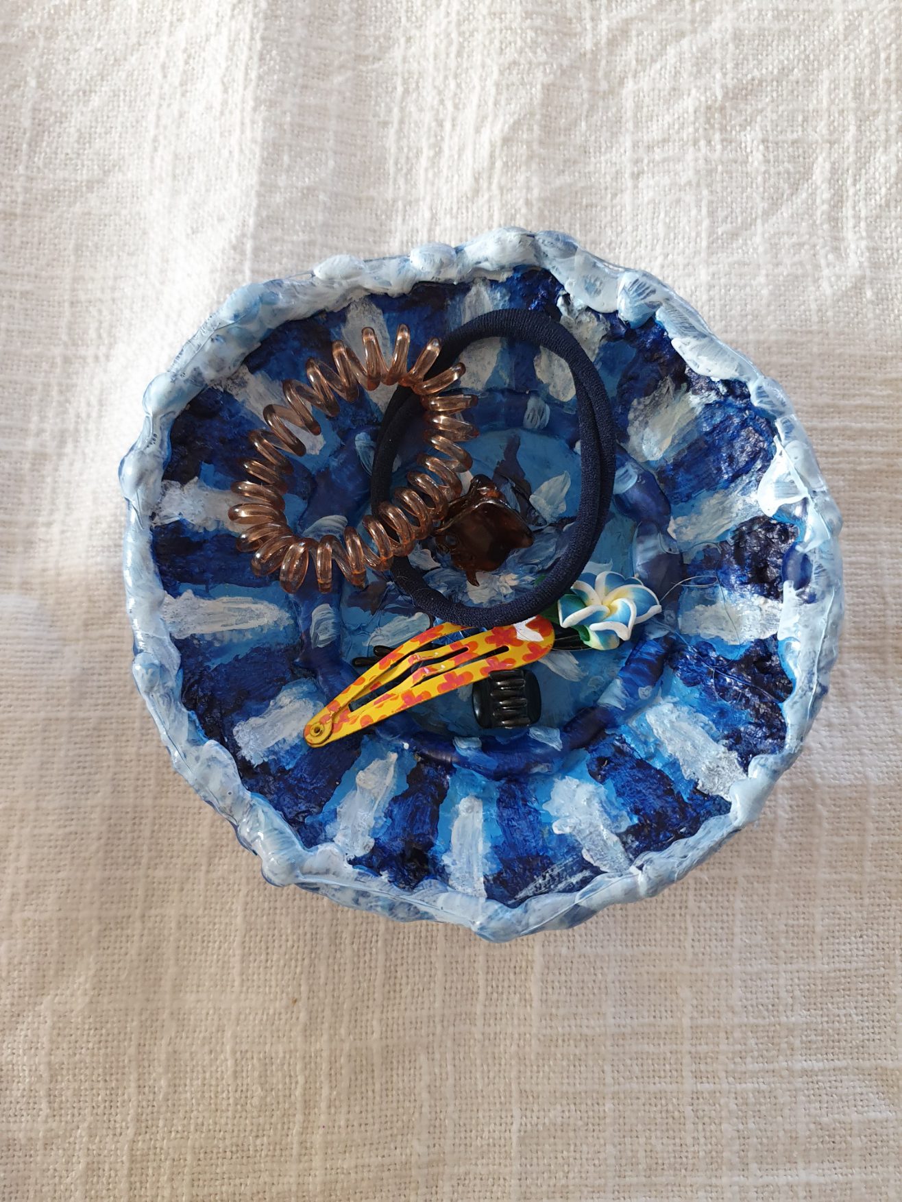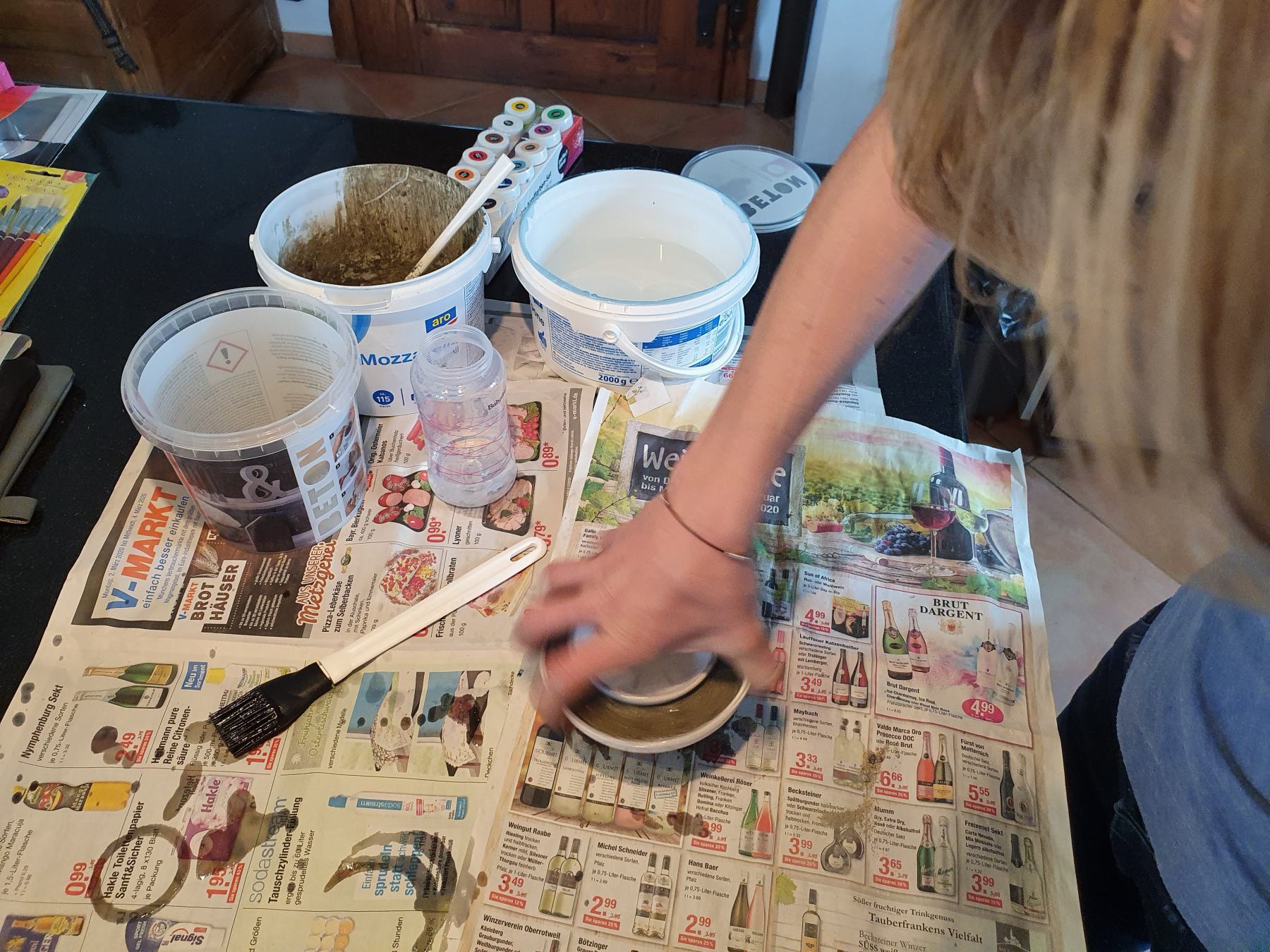 Ich mache heute kleine Schälchen, die als Seifenteller oder Schmuckschälchen verwenden werden können – oder für was auch immer man Schälchen verwenden möchte. In meinem Fall tatsächlich Seifenschälchen. Mit Acrylfarben gestaltet, passen die perfekt in mein Badezimmer.