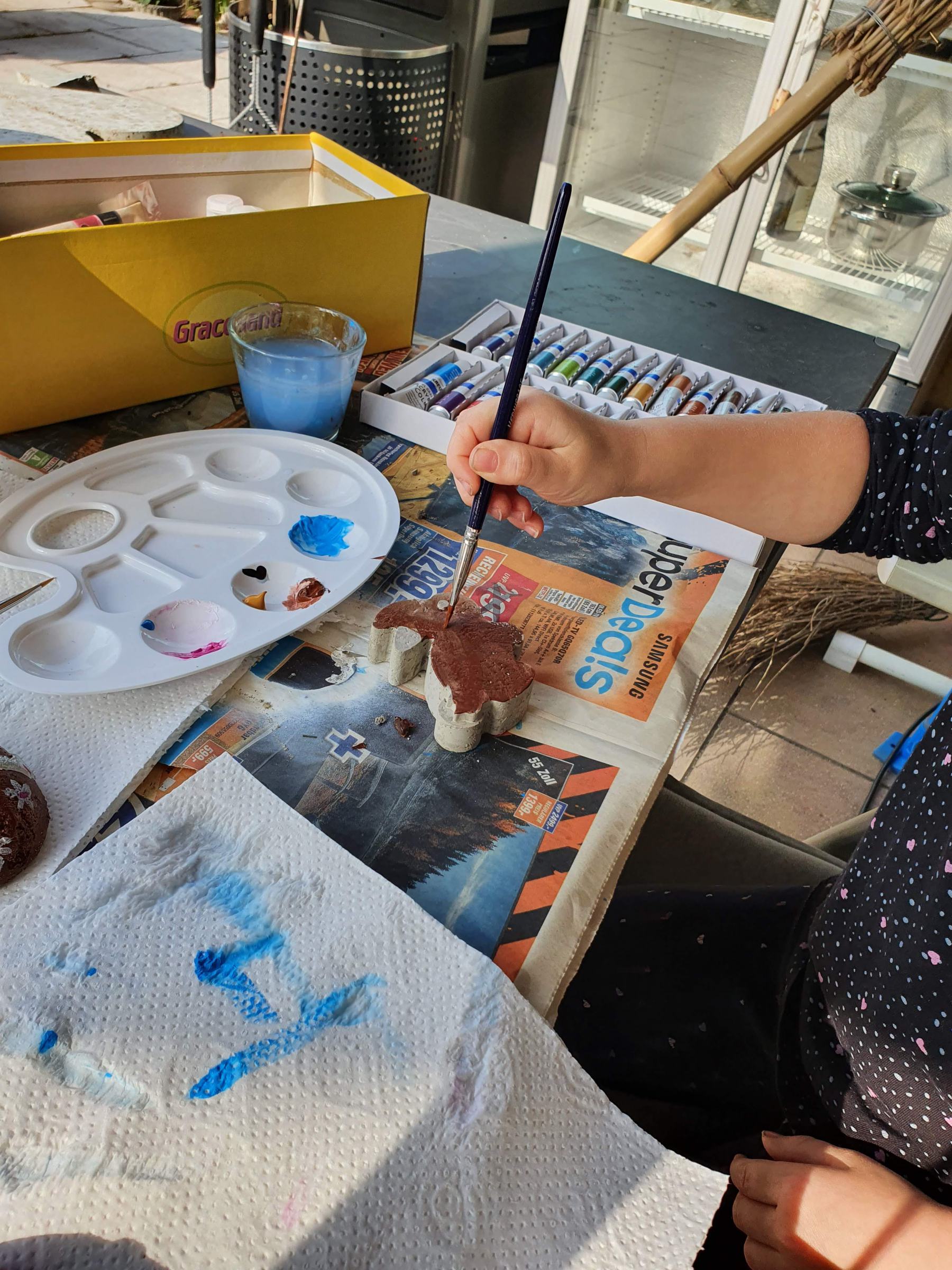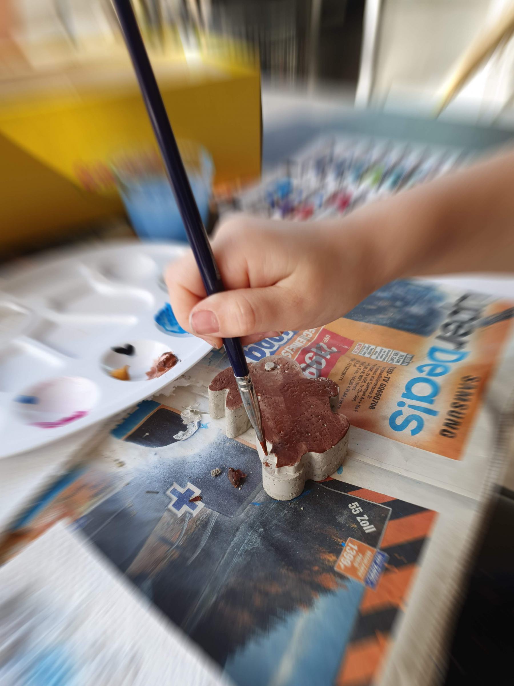 Wenn Euer Beton ausgehärtet ist, dürft ihr in aus der Form stürzen. Gegebenenfalls müsst ihr die Ränder mit einem Schmirgelpapier ein bisschen abfeilen und dann kann nach Lust und Laune bemalt werden – auf die Pinsel fertig los…