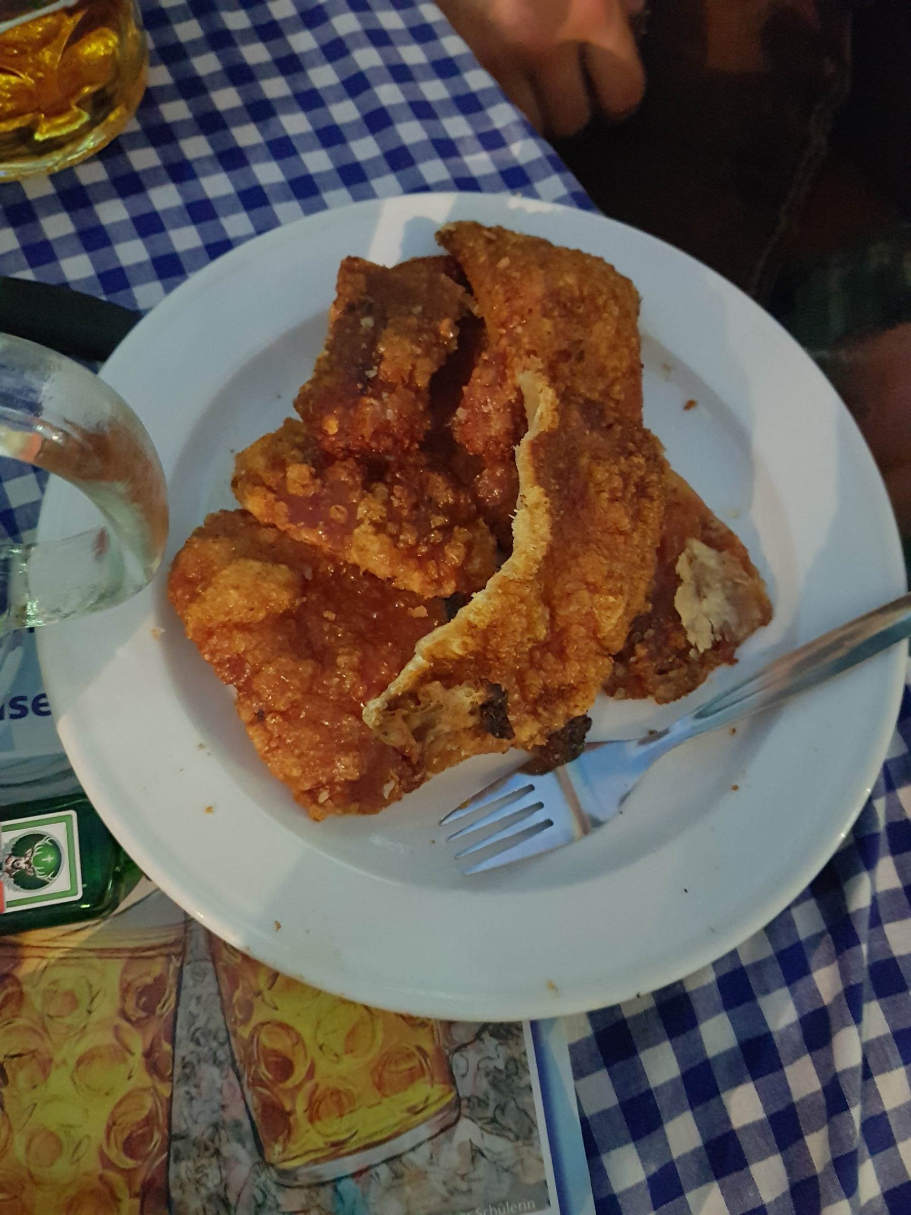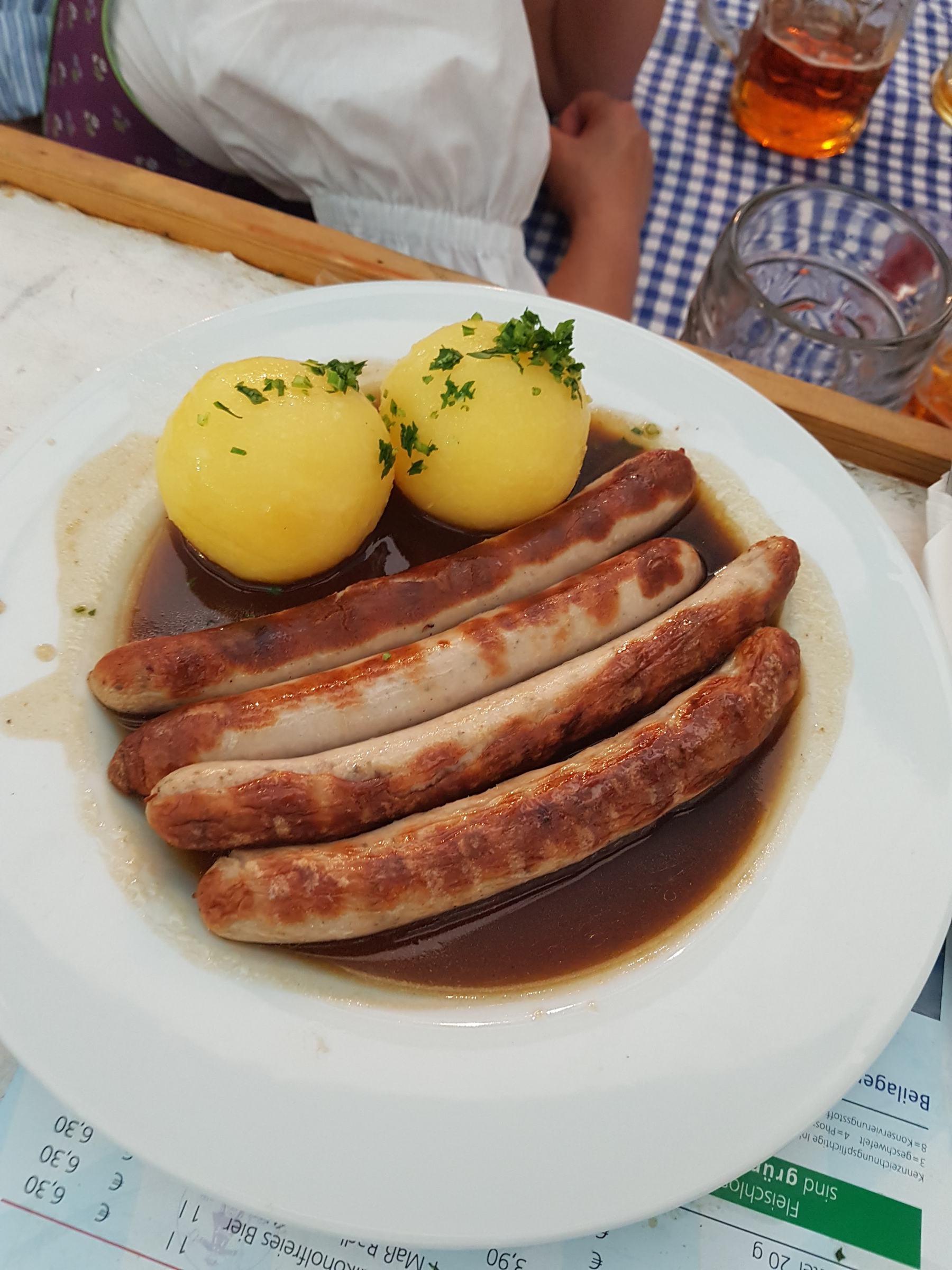 Ich geh durch die Reihen und nehme die Essensbestellungen auf. Wir haben in Dachau 4 Stationen Küche. Das bedeutet, die Bedienung muss ich 4-mal anstellen. Bekanntlich wird bei so großen Gruppen die Speisekarte rauf und runter bestellt. Also ziemlich sicher kann ich mich überall anstellen um das Essen für meine Gäste zu holen. Tischweise Essen ist in diesem Fall fast unmöglich und würde unendlich lang dauern. Also sortiere ich die Bestellungen nach Küche. Erst Hendl, dann Würstl und Rollbraten, dann warme Küche, dann kalte Küche. Oder je nach dem, wo die Schlange am kürzesten ist. Normal bringe ich ca. 10 Essen auf einmal raus. Das kann ich gewichtstechnisch gut tragen und die Chance das noch Schweinebratensoße auf dem Teller ist, ist relativ groß. Einzige Ausnahme: Pfandl und Ente. Die werden in Eisenpfannen serviert und bei 8 Eisenpfannen auf dem Schlitten ist in Boxe 8 mein körperliches Soll erfüllt. Weil der Weg weit ist. Und weil die Pfandl schwer sind.